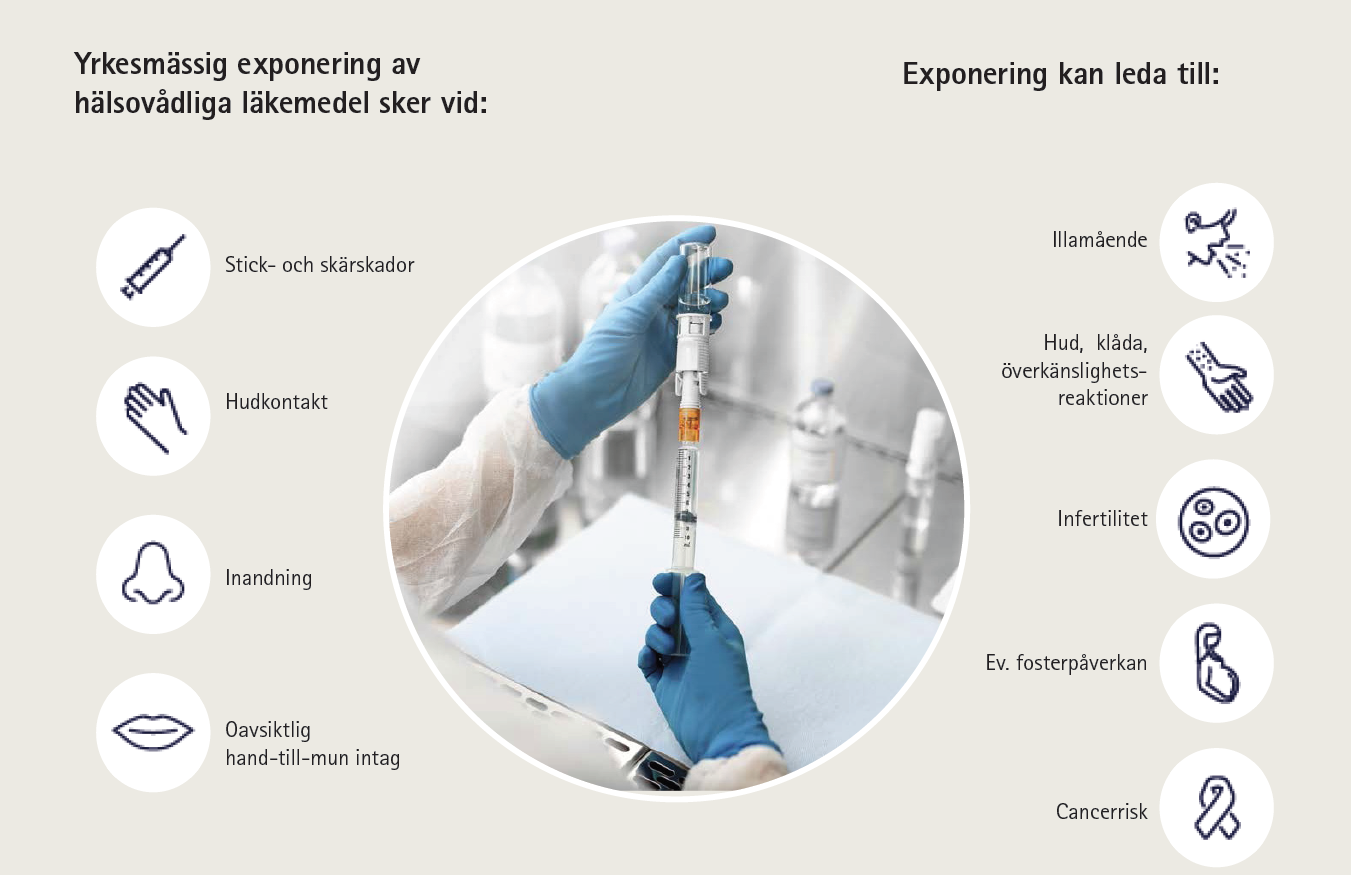 Exponering av hälsovådliga läkemedel kan uppstå genom inandning av läkemedelsångor i form av aerosol, hudkontakt, eller av misstag intag via hand till mun, eller oavsiktlig stick- och skärskada.